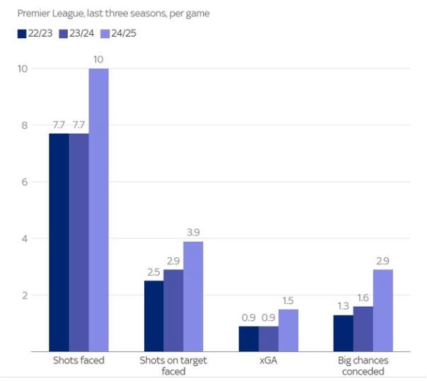 Man City với sự vắng bóng của Ruben Dias là một bất lợi, trong mùa giải Premier League 2024/25 họ đã để thủng lưới khá nhiều. Con số thủng lưới lên đến 30 bàn cho 23 trận đấu một điểm số đáng buồn. Chưa đi hết mùa giải nhưng nếu thống kê thì chỉ còn 4 đơn vị nữa thôi là sẽ bằng tổng số bàn thua của họ trong mùa giải thi đấu trước đó.